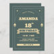 Celebrate this milestone in style with this elegant vintage-inspired 18th birthday invitation featuring a sophisticated deep green background with bold cream typography and geometric accents.