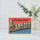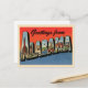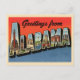 This design is a classic vintage-style postcard featuring the phrase "Greetings from Alabama" in large, stylised letters. Each letter of ALABAMA contains a unique scene or landmark from the state, including historic buildings, cityscapes, and natural landscapes. The overall aesthetic has a nostalgic, mid-century feel, making it perfect for products like postcards, posters, and t-shirts for anyone who loves retro designs or Alabama's heritage.