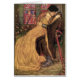 A vintage book illustration titled "The Last Hour" by Florence Susan Harrison depicts Guinevere in a passionate kiss and embrace with Lancelot. The illustration is from the book "Guinevere and Other Poems by Tennyson." The artist, Florence Susan Harrison (1877-1955) was born on board the Windsor Castle, a ship bound from London to Brisbane, Australia. Her father, Norwood Harrison, was a master mariner and ship’s captain, and his family spent much time of their time at sea with him. In between voyages, Florence attended a school run by a great-aunt in Folkestone, England. As an adult, Florence lived in England and for some time in Belgium. She was an Art Nouveau and Pre-Raphaelite illustrator of poetry and children’s books including some books of her own poetry. Following Florence’s death, her artwork was often mistakenly attributed to Emma Florence Harrison, a Victorian-era artist who exhibited at the Royal Academy in the 19th century. To this day, Florence Susan Harrison’s artwork can be found on many Internet art websites incorrectly attributed to Emma Florence Harrison. This card is blank inside for your own message.