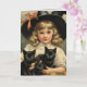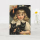 Vintage Halloween cutie in large pointed hat with black kittens "Witching you a very haunted Halloween!" is a funny quote inside the card with an old textile-looking background. Great for anyone who loves vintage images, witches, cats, and word plays.