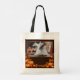 Halloween tote bag with a vintage image from 1911 of a little girl in nightgown holding a candle to a mirror to see a ghost behind! The spooky ghost is a trick from a little Halloween sprite. Something different and unique Halloween shopping, a party, or Halloween candy bag.