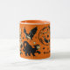 Treat yourself to a pumpkin spice quaff or your favourite hot beverage with this personalised coffee mug. The name appears on both sides of the mug and is surrounded by vintage style Halloween graphics including a witch, some cats, a bat, a jack-o-lantern pumpkin and an owl. The black and cream graphics are set against an orange background.