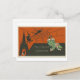 This postcard is a reproduction of a vintage Halloween postcard that features a witch, a spiderweb with spider, and a falling clown.