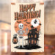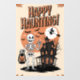 Dive into the nostalgic atmosphere of Halloween with this vintage design, featuring a jovial skeleton holding a pumpkin lantern, accompanied by a house haunted under a full moon. Ideal for Halloween-themed decorations or invitations, this visual is perfect to bring a retro touch to your frightening celebrations. Experience Halloween with style and humor with this original design!