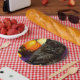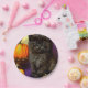 Paper Plates featuring a vintage Halloween kitten! A fluffy black kitty poses next to pumpkins against a purple background. A fun gift for Halloween parties and cat lovers!
