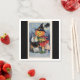 A Cute Halloween Pumpkin Witch is stirring up something in a big black cauldron while a black cat is watching overhead. Image of a Vintage Halloween Postcard on a black background.