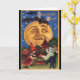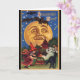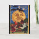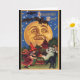 A vintage Halloween card image features a young witch and her boiling cauldron, a black cat, and bats flying overhead. The night sky holds stars and a huge full moon with a face. The card says, "Halloween Time" on the front. The verse inside the card is, "Shadows of a thousand years rise again unseen, Voices whisper in the trees, Tonight is Halloween."