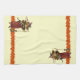 Cute witch carries her black Halloween cat on yellow tone towel with a hem of Autumn coloured flowers