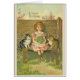 A vintage birthday card image features a sweet little girl sitting on a bench, holding a bouquet, while a cat sits on each side of her. The front of the card says "A happy birthday" and the message inside is: "It’s always a treat to wish a happy birthday to someone so sweet."