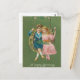 This postcard features a public domain vintage image from the 1920s of a couple sharing a swing shaped like a lucky horseshoe with the message "A Happy Birthday" across the bottom.