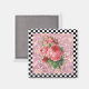 Pretty vintage pink roses botanical illustration on pink floral background with black and white chequerboard pattern border creates a lovely garden theme design.