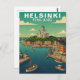 Capture the serene maritime beauty of the North with this elegant Helsinki, Finland Travel Card. This vintage-style illustration features a bustling harbor filled with traditional fishing boats and market stalls along the pier.