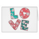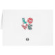 This vintage note card features the word Love in a red pink and green hippy font with flowers and hearts highlighted against a creamy white background.