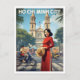 Step back in time with this stunning, vintage-style travel postcard celebrating Ho Chi Minh City, Vietnam (formerly Saigon). This artwork features a radiant Vietnamese woman in a traditional red Ao Dai (long dress), holding a classic nón lá (conical hat), standing on a busy street. The backdrop showcases the beautiful architecture of a prominent HCMC landmark (likely the Nha Tho Tan Dinh or similar), framed by lush tropical palm trees.