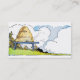 A custom business card with brown and orange retro script and block letters and a vintage etching of a happy straw beehive with buzzing bees against white clouds.