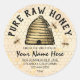 Elegant vintage honey jar stickers featuring a rustic honeycomb gold background, a honey bee hive, honeybees, and your details.