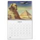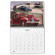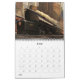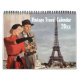 12 month vintage illustration travel calendar featuring travel scenes including cruise ships, aeroplanes, trains, cars and a bus depot.