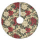 Tree skirt featuring a vintage inspired pattern of white and red poinsettia plants with green leaves on a tan background.