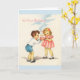 A vintage birthday card image features two young children. The boy is handing a pink birthday cake with lit candles to the little girl who's wearing her pretty pink party dress. The front of the card says, "It's Your Birthday!" and the message inside the card is, "Hope fun and friends will come your way with love and joy on your special day."