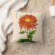 Throw pillow in a vintage Japanese illustration of a chrysanthemum, in shades of orange and gold, with a golden yellow centre and leaves in emerald and lime green, on an off-white / cream background, digitally enhanced