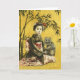 This card is illustrated with a vintage young Japanese geisha with a small demon on her lap. This oriental style artwork was painted in acrylic on fine cotton and has an aged vintage feel. Perfect for those who love decorative exotic art.