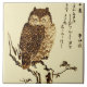 Digitally enhanced vintage Japanese ink sketch of an owl on a branch in sepia brown ink