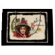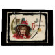 A Vintage Jolly Halloween Witch with a moon, owl, and tiny bat behind the witch. Greeting: Jolly Hallowe'en. Image of a Vintage Halloween postcard on a black background.