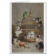 Vintage artwork by Carl Reichert features a group of kittens who have opened a bird cage and let a parrot out so that they can explore inside the cage. The parrot calmly sits on top of the cage, seemingly unafraid of the kittens. The Austrian artist, Carl Reichert (1836-1918) was the son of Austrian portrait and animal painter, Heinrich Reichert. Carl, born in Vienna, followed in his father’s footsteps as a painter of animals and town scenes, but he was most famous for his paintings of animals, especially dogs and cats. This card is blank inside for your own message.