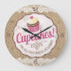 Pretty in pink and brown , a chocolate cupcake with frosting and pink heart on a kitchen clock with burlap and lace background, perfect for a bakery, or home-baking girly kitchen