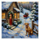 A classic vintage Christmas painting featuring a Labrador Retriever in front of a cozy winter cottage. Perfect for adding nostalgic charm and holiday warmth to your décor or greeting cards.