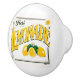 A vintage fresh lemonade advertisemnt sign. In colours of white, yellow, green and black. A little smiley sun peeking out from the corner and bright yellow leafy lemons accent this piece.