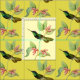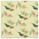 A green and gold hummingbird perches on the branch of tropical plant with bright pink flowers. Shown on a yellow background; select "Customise it" to change background colour.