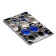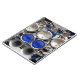 A photographic design of a vintage motor scooter covered in lights and horns.