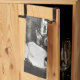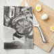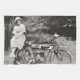 An American Mojo kitchen or tea towel with a vintage sepia photo c1920 of my happy smiling grandmother sitting on the back of an old motorbike. I don't know the make but the bike is belt drive, has acetylene lights and Premier on the crankcase.