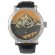 A vintage-inspired design featuring a majestic mountain peak bathed in the warm glow of a setting sun. The mountain is surrounded by a dense forest of pine trees, creating a peaceful and serene atmosphere.