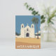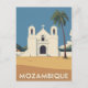 A peaceful, vintage-style travel poster featuring an artistic illustration of a historic white church in Mozambique, Africa. The design captures a bright, sunny scene with a towering palm tree and simple architecture, evoking the colonial and coastal charm of this Southern African nation. This retro-inspired artwork is perfect wall décor for travel enthusiasts, fans of African art, and those who appreciate the clean lines and mid-century modern aesthetics of a tropical destination.