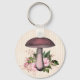 Pretty vintage look keychain design features pink tinted mushroom with pink florals and lush green leaves on a vintage striped background