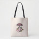 Pretty vintage look women's tote bag features pink tinted mushroom with pink florals and lush green leaves on a vintage striped background