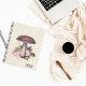 Pretty vintage look bullet journal design features pink tinted mushroom with pink florals and lush green leaves on a vintage striped background. Personalize your planner with monogram or name in pretty script font
