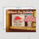 Add a touch of whimsy to your correspondence with this charming vintage-inspired postcard featuring handcrafted mushroom decorations nestled on a rustic wooden shelf – perfect for nature lovers and collectors of quaint home decor.