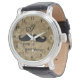 Vintage mustache watch for men. Numbered plate with black handlebar moustache and funny quote; I mustache you a question. Cool distressed parchment look background paper design. Grunge style retro letters. Trendy gift idea for dad, uncle, grandpa, boyfriend, brother etc.