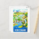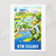 This postcard is a reproduction of a vintage travel poster advertising New Zealand.
