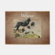 Vintage Newfoundland dogs in burlap look background . The antique illustration was edited and applied on this item by Alma Wad . Rustic door mat for a dog lover 's home . You can customize the text "Welcome " now .