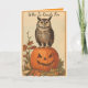 Awesome , vintage picture of an owl standing on a smiling pumpkin with Fall leaves, is featured on this Halloween greeting card. Front of the card reads, "Who Is Ready For" and inside of the card reads, "Halloween? You that's whooo. Happy Halloween". A nice and not scary greeting card to send family, friends and small children for Halloween!