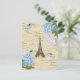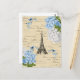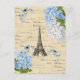 A great vintage Eiffel Tower with beautiful blue and white vintage hydrangeas and blue butterflies is set on a vintage French postcard in sepia cream with handwriting and postmarks to make a lovely floral French and Paris themed postcard.