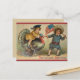 This vintage patriotic Thanksgiving postcard features one child riding a turkey being led by another child carrying the American flag.