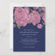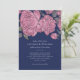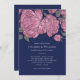 This wedding invitation features dramatic navy blue background with painted vintage pink peony blossoms.