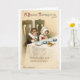 Vintage picture of two pilgrim children praying at their Thanksgiving dinner, is featured on this Thanksgiving greeting card. Front of card reads, "A Blessed Thanksgiving. With thankful and contended heart". Inside of card reads,"We in America have been very blessed! Wishing you and your family a Thanksgiving of Joy and Happiness". A sweet card to send to family and friends for the Holiday!