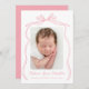 Celebrate your little one's arrival with our elegant Vintage Pink Bow birth announcement. Showcase your newborn's photo framed by a charming pink bow, with your baby’s name in a lovely handwritten pink script. Below, you can add birth details like weight, length, and date. The back offers space for an extra photo and a personalised message to loved ones. This customisable keepsake is the perfect way to announce your newest family member with style and grace!