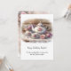This image is a soft, romantic watercolor-style illustration of a vintage tea setting arranged on a lace-covered wooden table. A delicate porcelain teapot, teacup, and matching saucer are decorated with blush pink roses and subtle floral details. Beside the teapot sits a small floral vase filled with pastel roses and airy blossoms, while additional pink roses and greenery rest gently on the table. The background features warm, weathered wood planks that add rustic charm, and the entire scene is framed by a gentle white vignette that softly fades the edges. The color palette is muted and elegant—creams, blush pinks, soft greens, and pale blues—creating a peaceful, shabby-chic atmosphere that feels cozy, timeless, and inviting. Personalize the front with recipients name and add a special message - the back gets another special message.